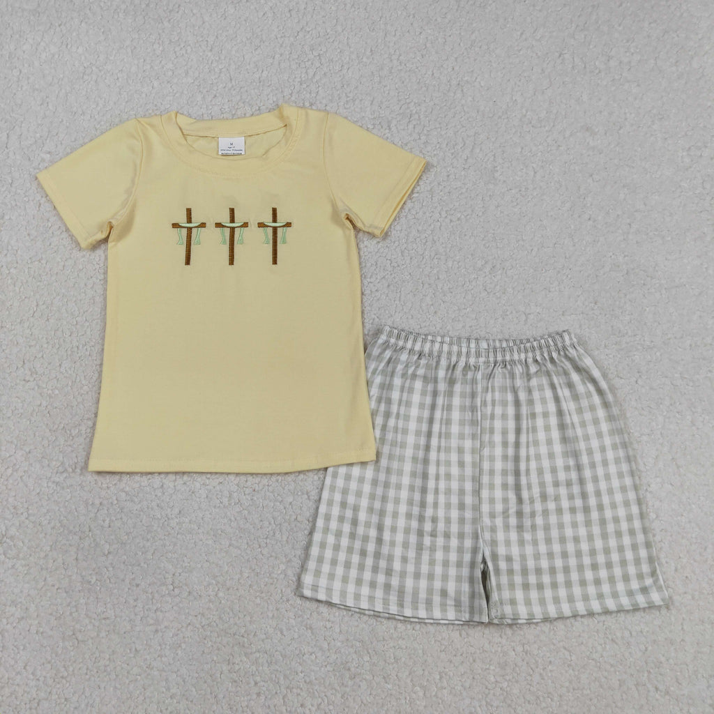 BSSO1717 Embroidery Easter He is risen Yellow Boys Shorts Set