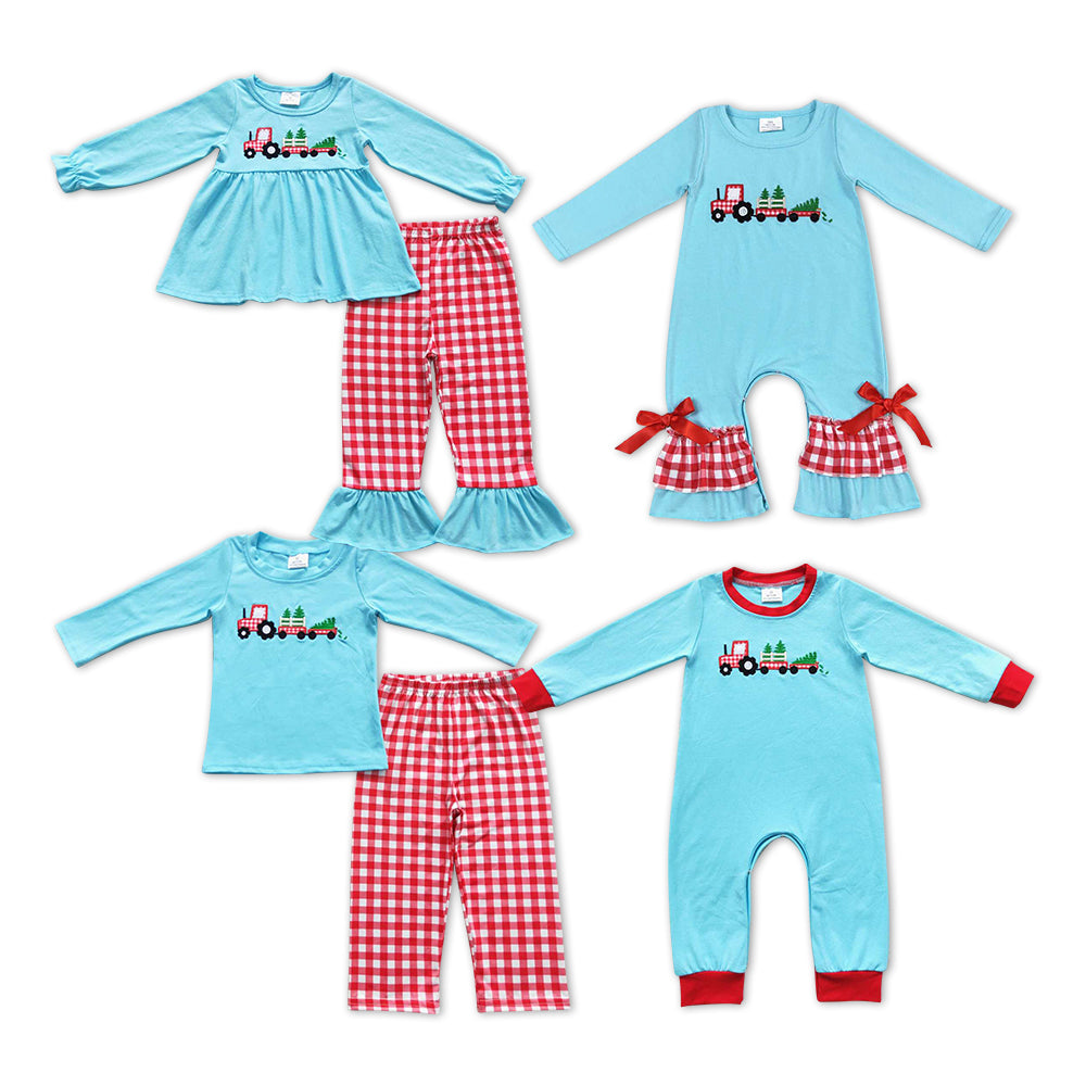 Christmas Embroidery Trees Car Truck Blue Kids Sibling Matching Clothes