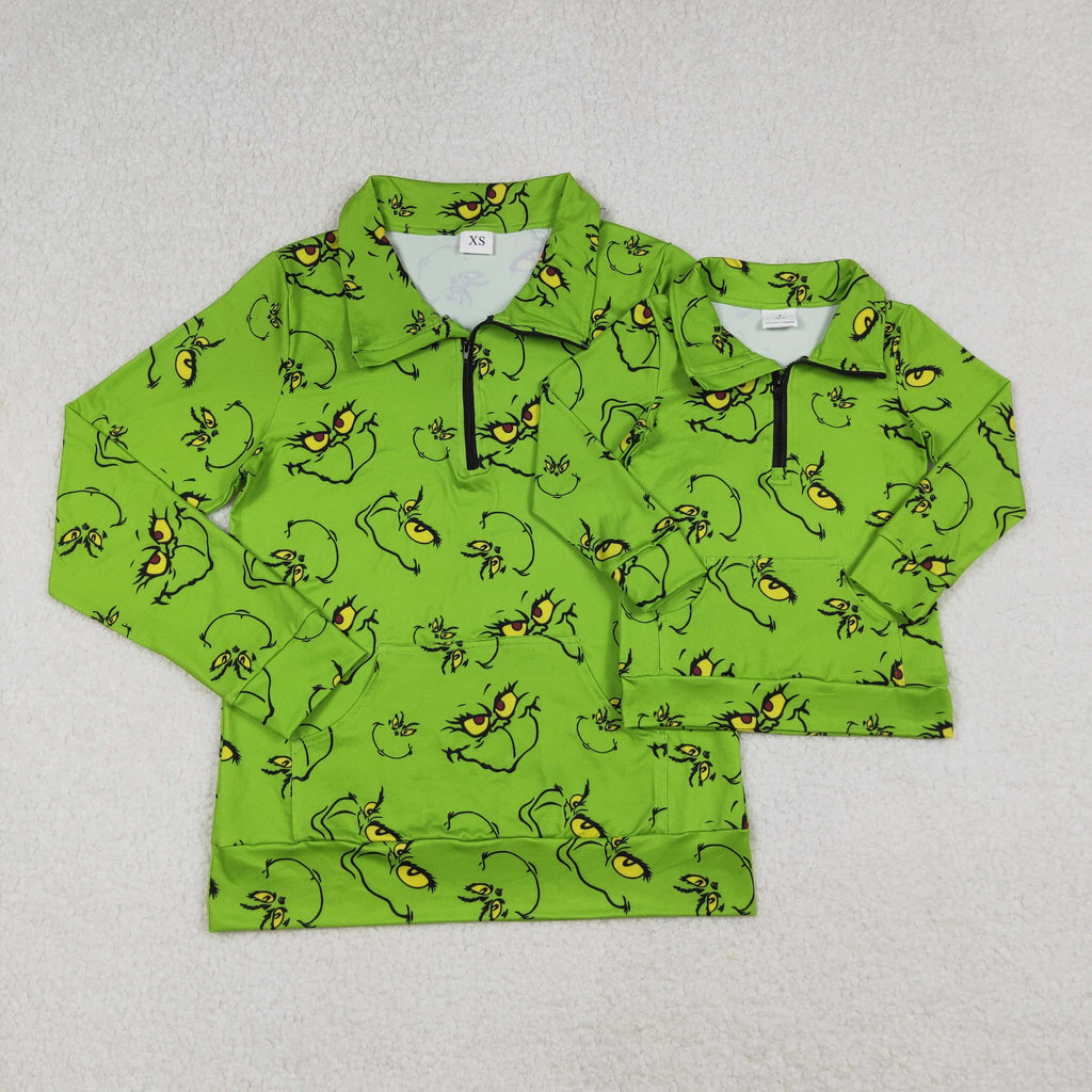 Christmas Mommy And Me Green Cartoon Zipper Pullover Shirt Top