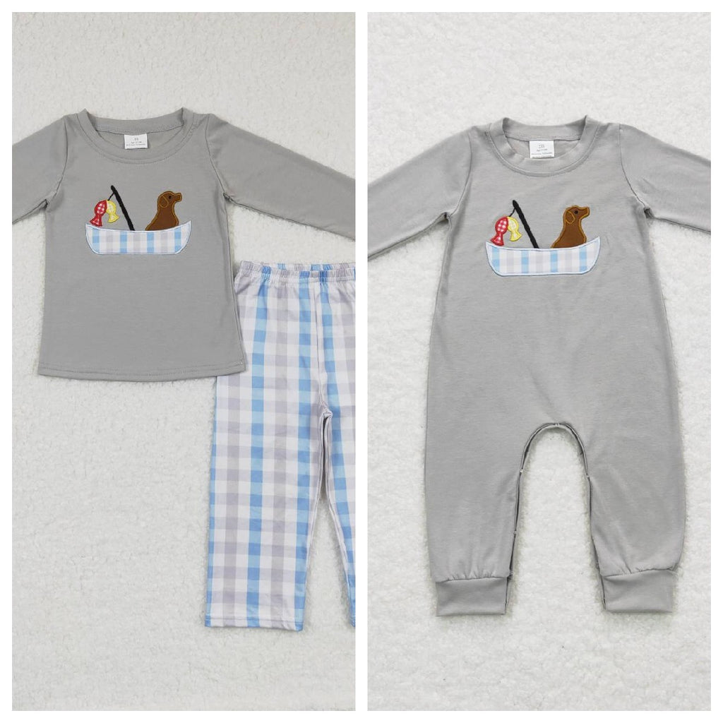 LR0690/BLP0350 Embroidery Fishing Dog Plaid Grey Kids Sibling Matching Clothes