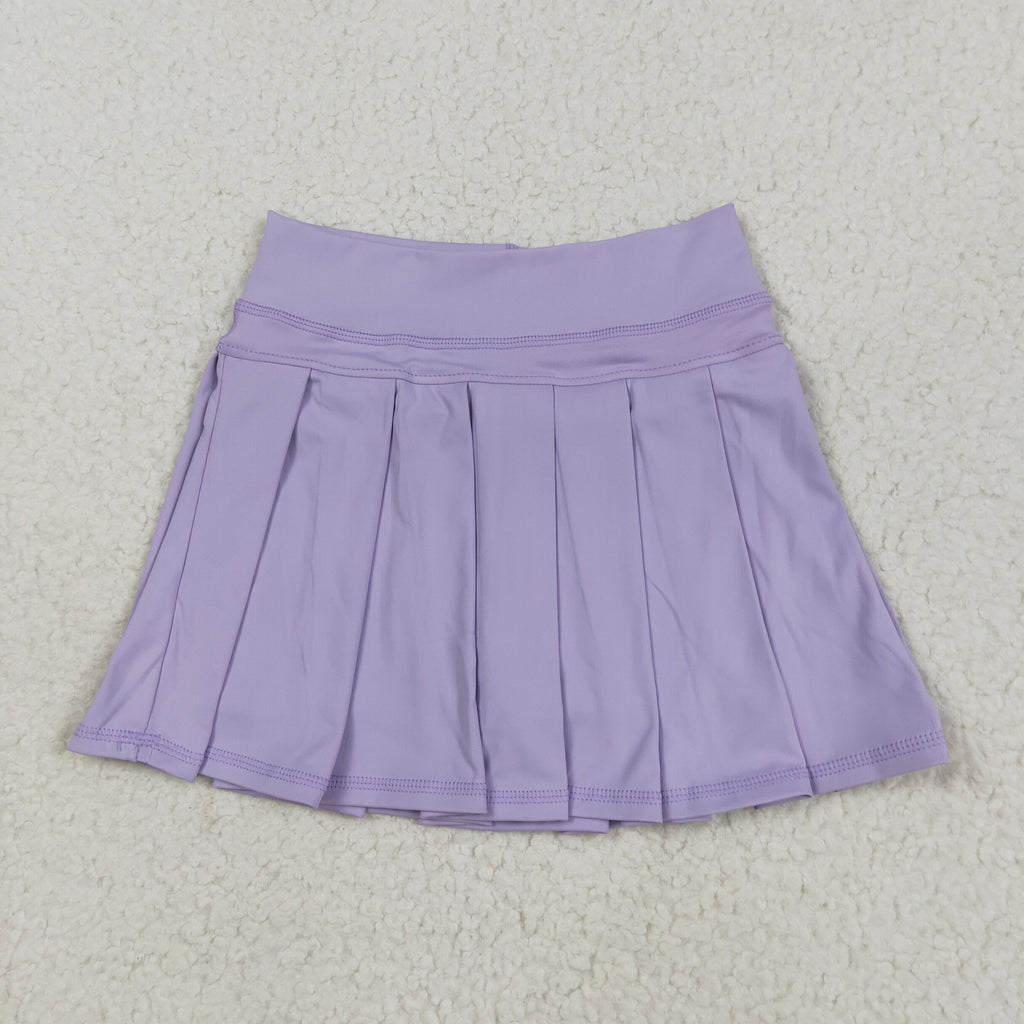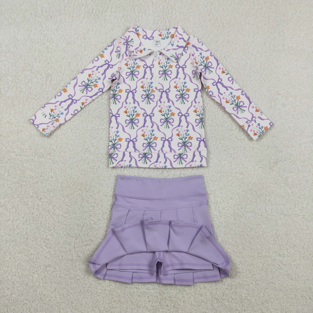 GLD1416 Flower Bouquet Bows Purple Yoga Pullover Girls Pleated Skorts Set