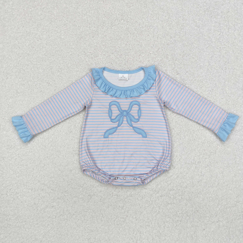 LR1379 Embroidery Coquette Bows Pink Stripe Baby Girl Bubble Romper