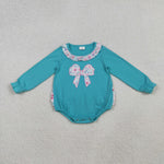 LR2432 Embroidery Flower Bows Blue Baby Girls Romper
