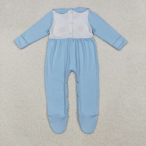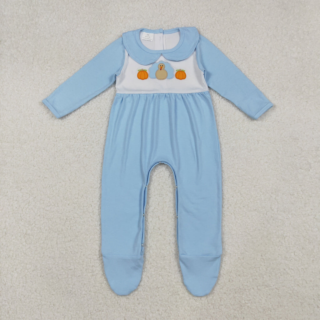 LR2562 EmbroideryThanksgiving Turkey Pumpkin Blue Baby Boy Romper