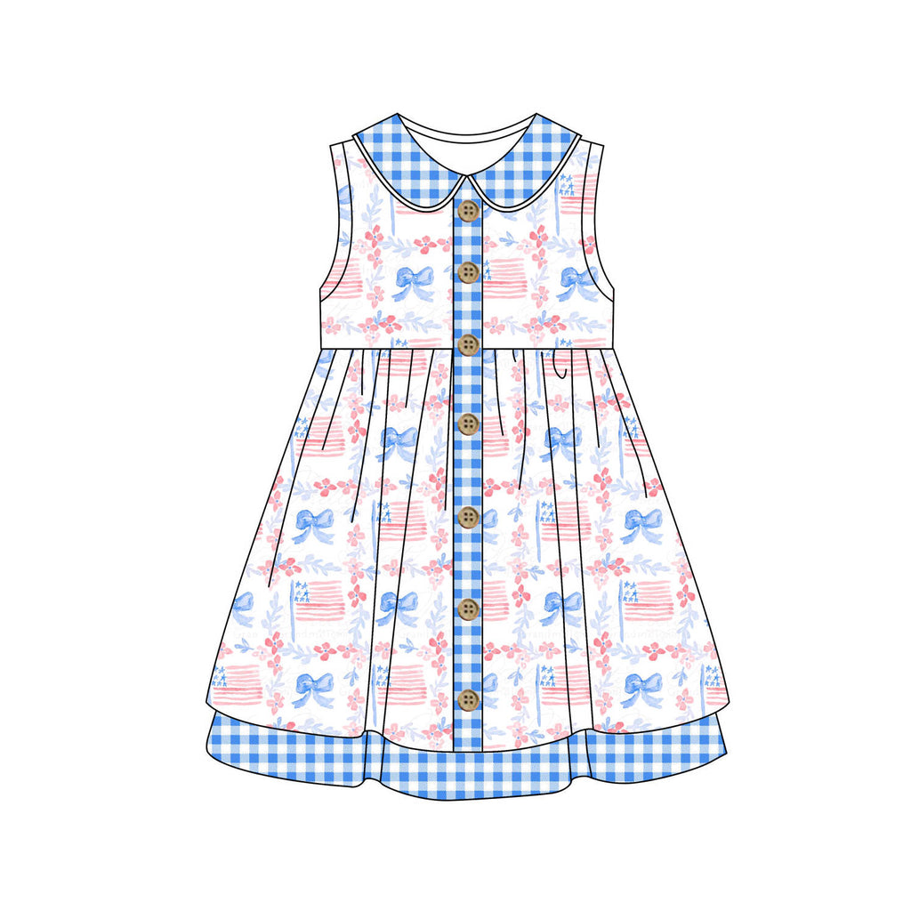 MOQ 5 pcs Custom Style 4th of July Flag Bows Buttons Girl Dress
