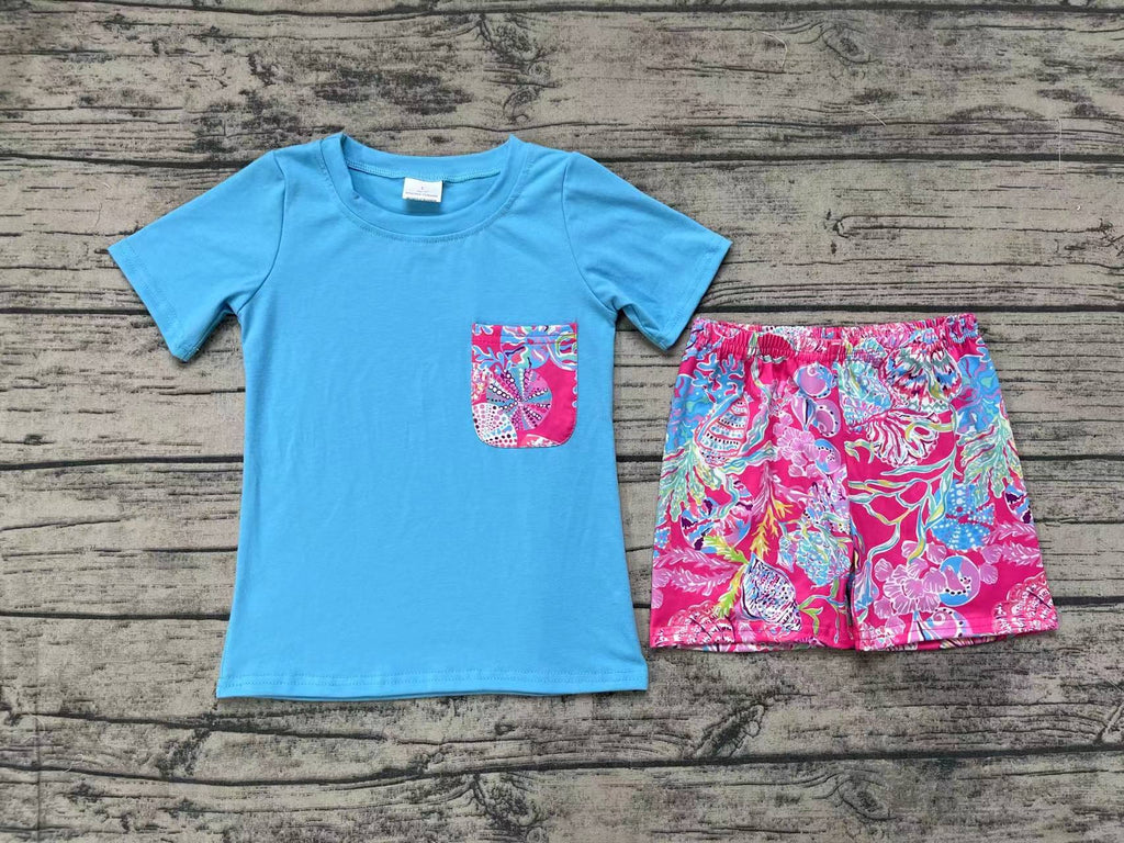 BSSO0841 Summer Garden Flower Blue Pink Boys Shorts Set