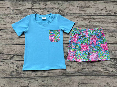 BSSO0846 Summer Garden Flower Blue Pink Boys Shorts Set