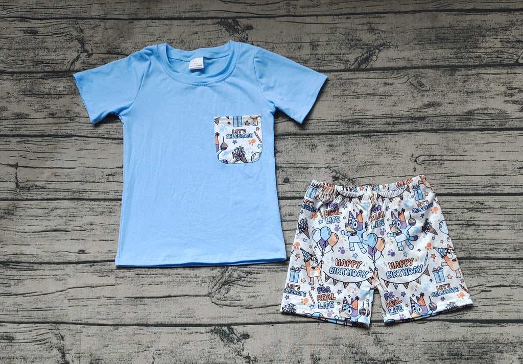 BSSO0907 Cartoon Happy Birthday Blue Dog Boys Shorts Set