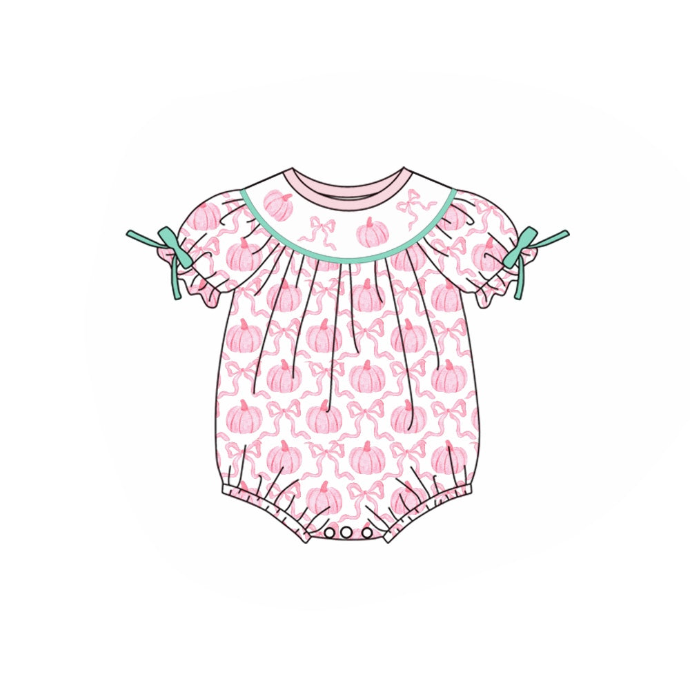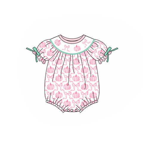 SR1904 Embroidery Pumpkin Bow Mint Plaid Pink Baby Girls Bubbles Romper