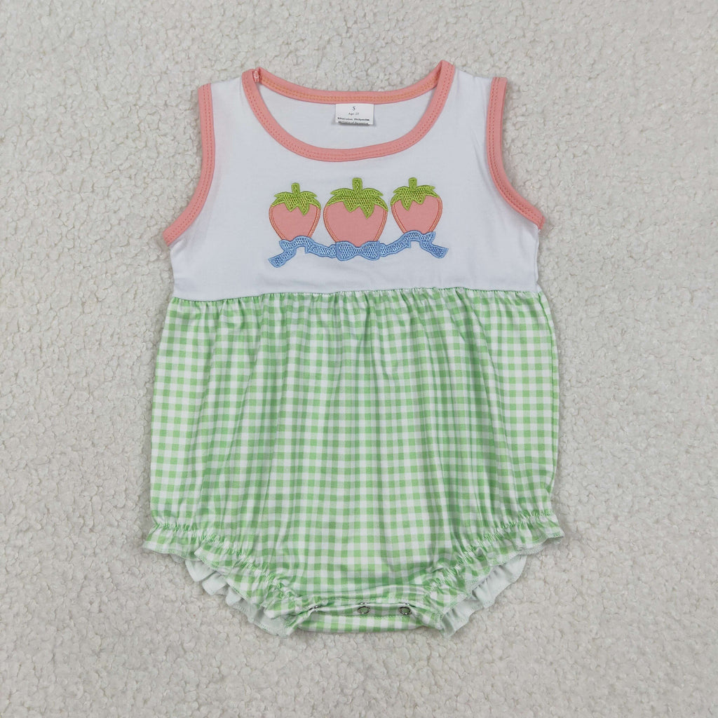 SR3725 Embroidery Strawberry Bows Green Plaid Pink Baby Girls Romper