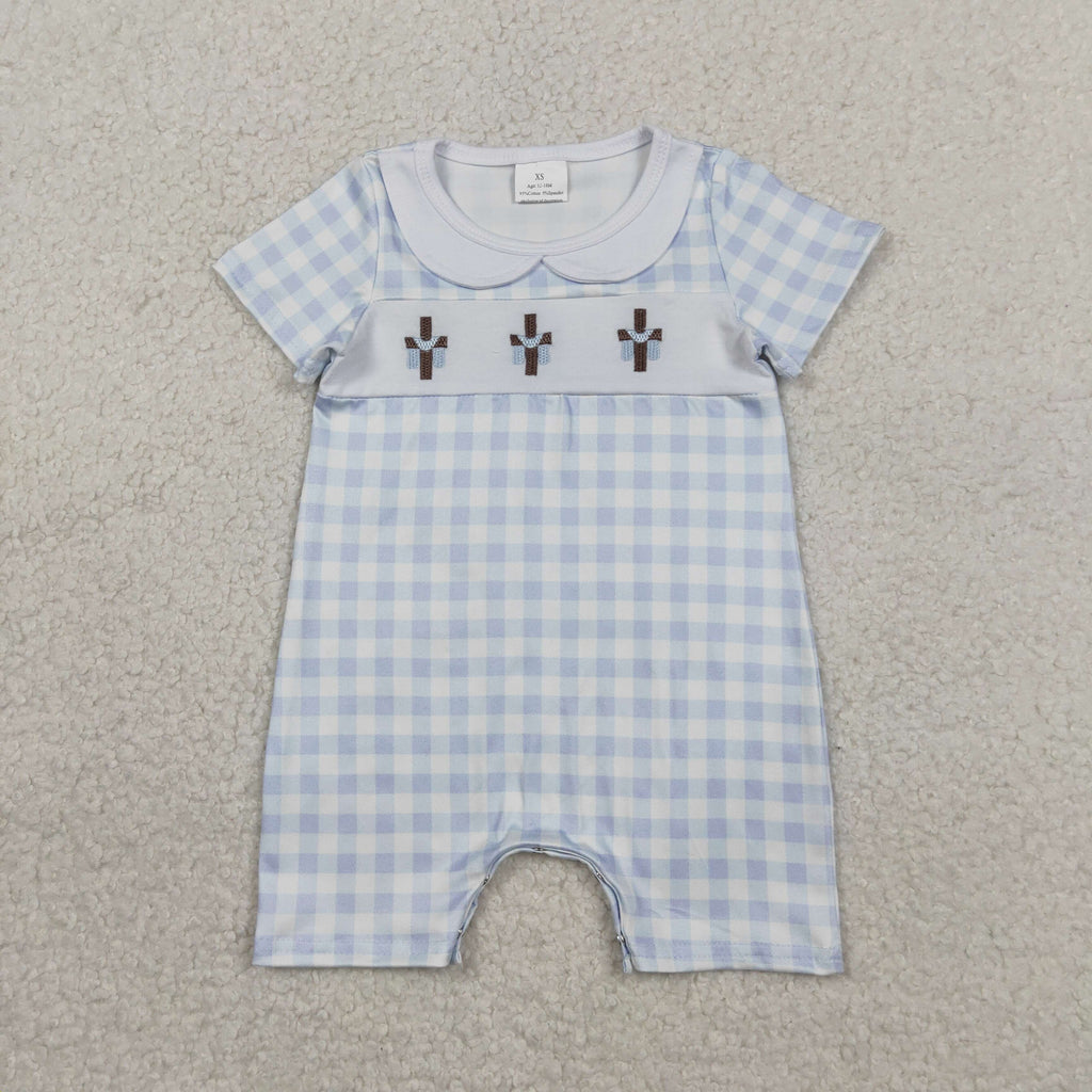 SR3758 Embroidery Easter Cross Blue Plaid Baby Boys Romper